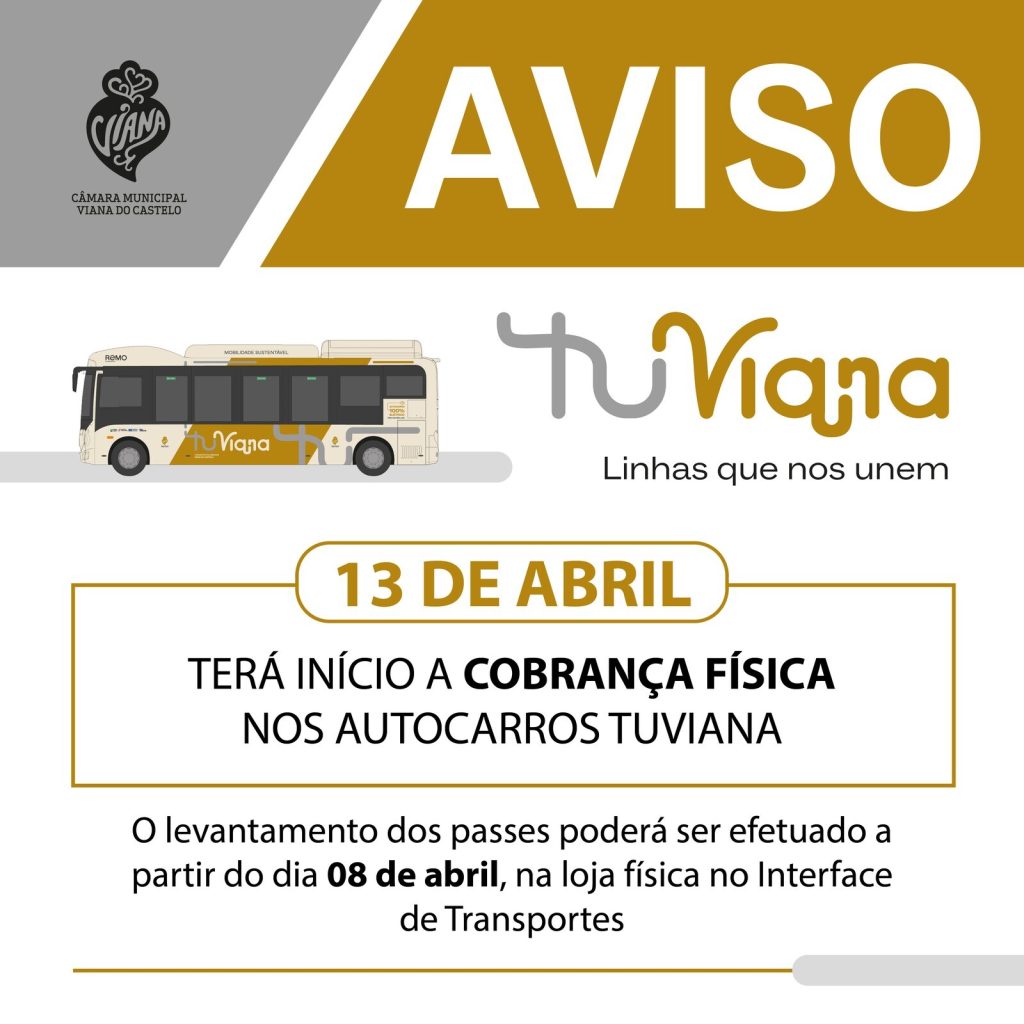 Em Viana do Castelo a partir de segunda feira, será o início a cobrança física de bilhete ou passe nos autocarros da operação TUViana – Transportes Urbanos de Viana. O tarifário TUViana conta com um passe geral de 20 euros (mais 5 euros de emissão), que reduz para metade, 10 euros, para seniores e pessoas […]